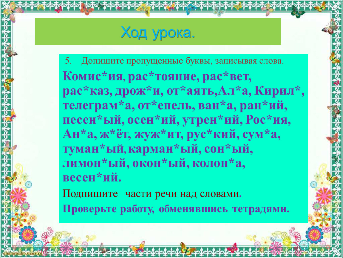 Комис*ия, рас*тояние, рас*вет, рас*каз, дрож*и, от*аять,Ал*а, Кирил*, телеграм*а, от*епель, ван*а, ран*ий, песен*ый, осен*ий, утрен*ий, Рос*ия, Ан*а, ж*ёт, жуж*ит, рус*кий, сум*а, туман*ыЙ, карман*ый, сон*ый, лимон*ый, окон*ый, колон*а, весен*ий.