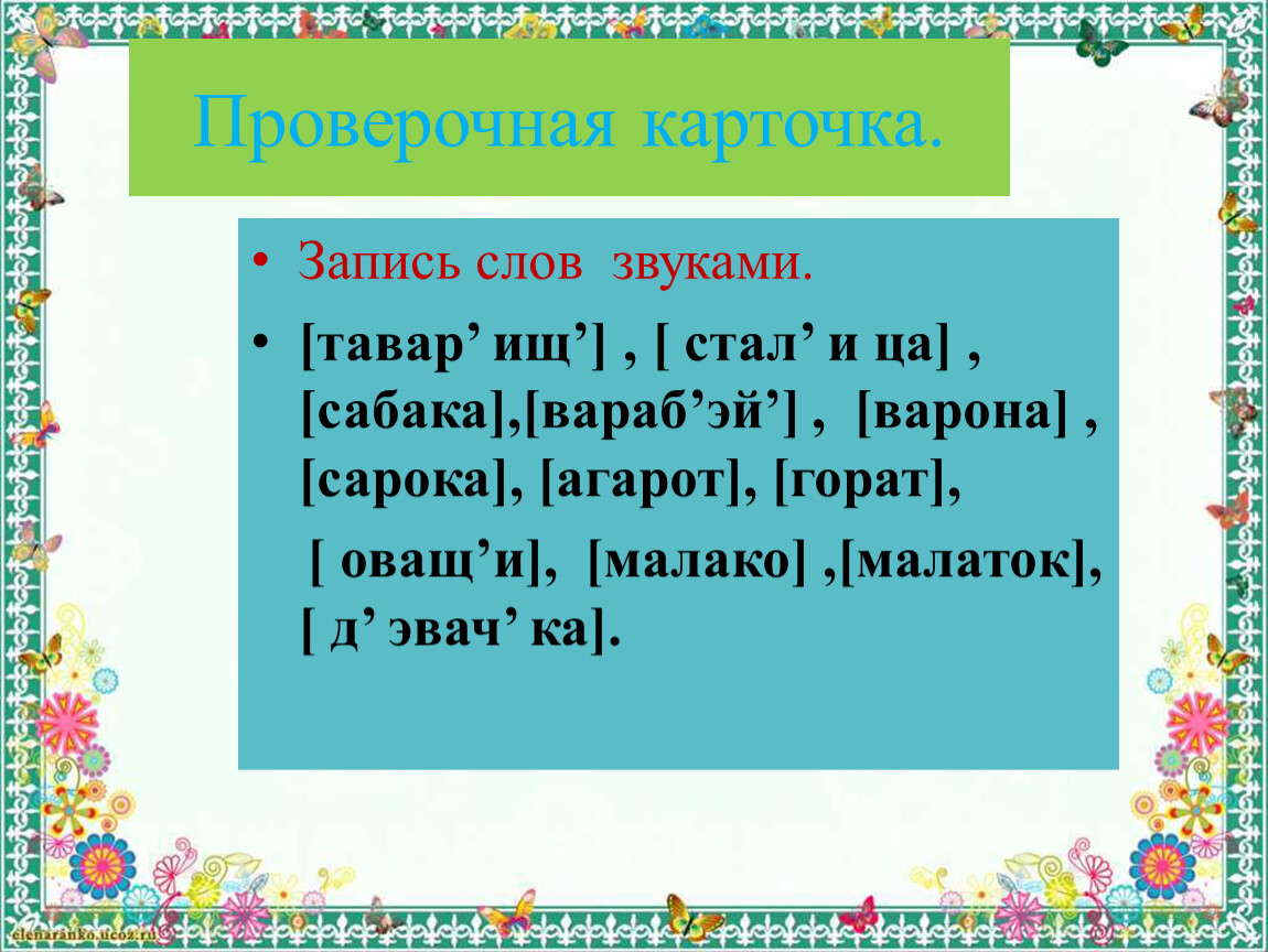 [тавар’ ищ’] , [ стал’ и ца] , [сабака],[вараб’эй’] , [варона] , [сарока], [агарот], [горат],