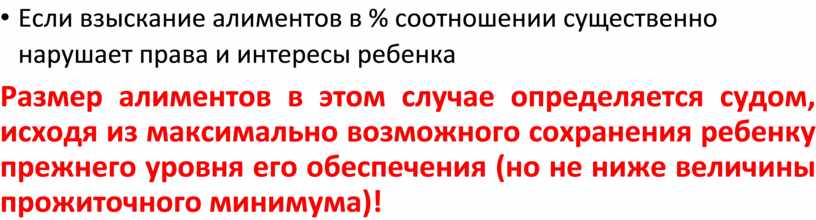 • Если взыскание алиментов в % соотношении существенно нарушает права и интересы ребенка