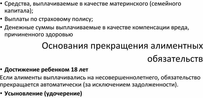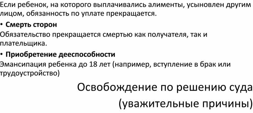 Если ребенок, на которого выплачивались алименты, усыновлен другим лицом, обязанность по уплате прекращается.