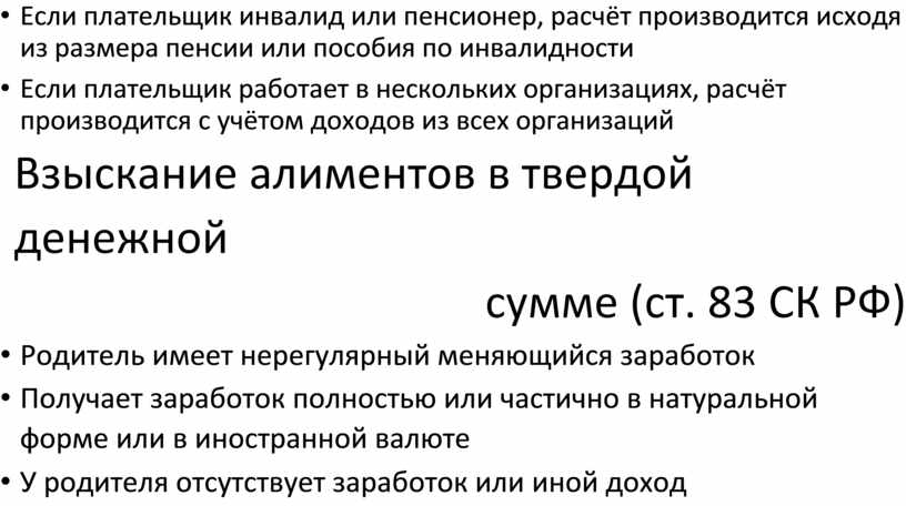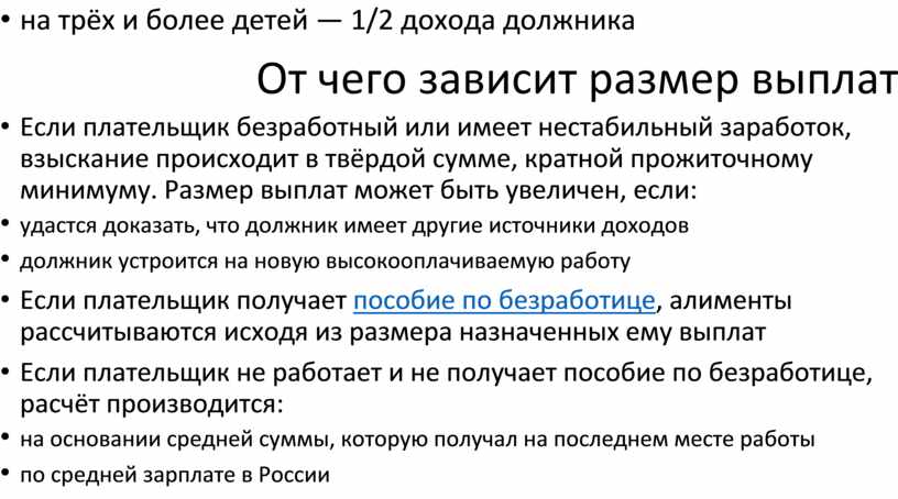 • Если плательщик безработный или имеет нестабильный заработок, взыскание происходит в твёрдой сумме, кратной прожиточному минимуму. Размер выплат может быть увеличен, если: