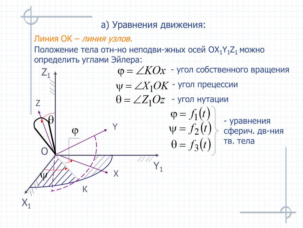 Положение тела отн-но неподви-жных осей ОX1Y1Z1 можно определить углами Эйлера: