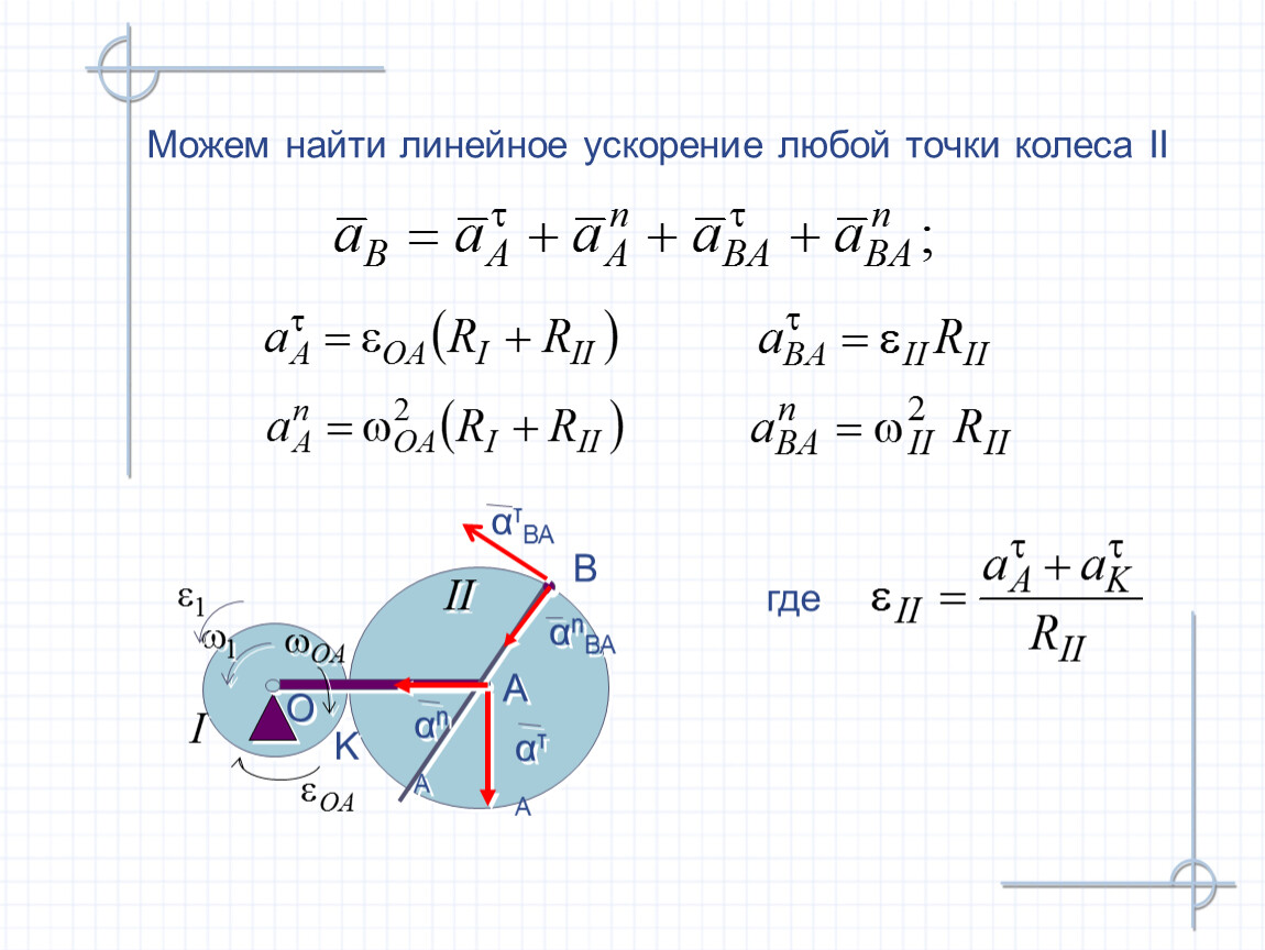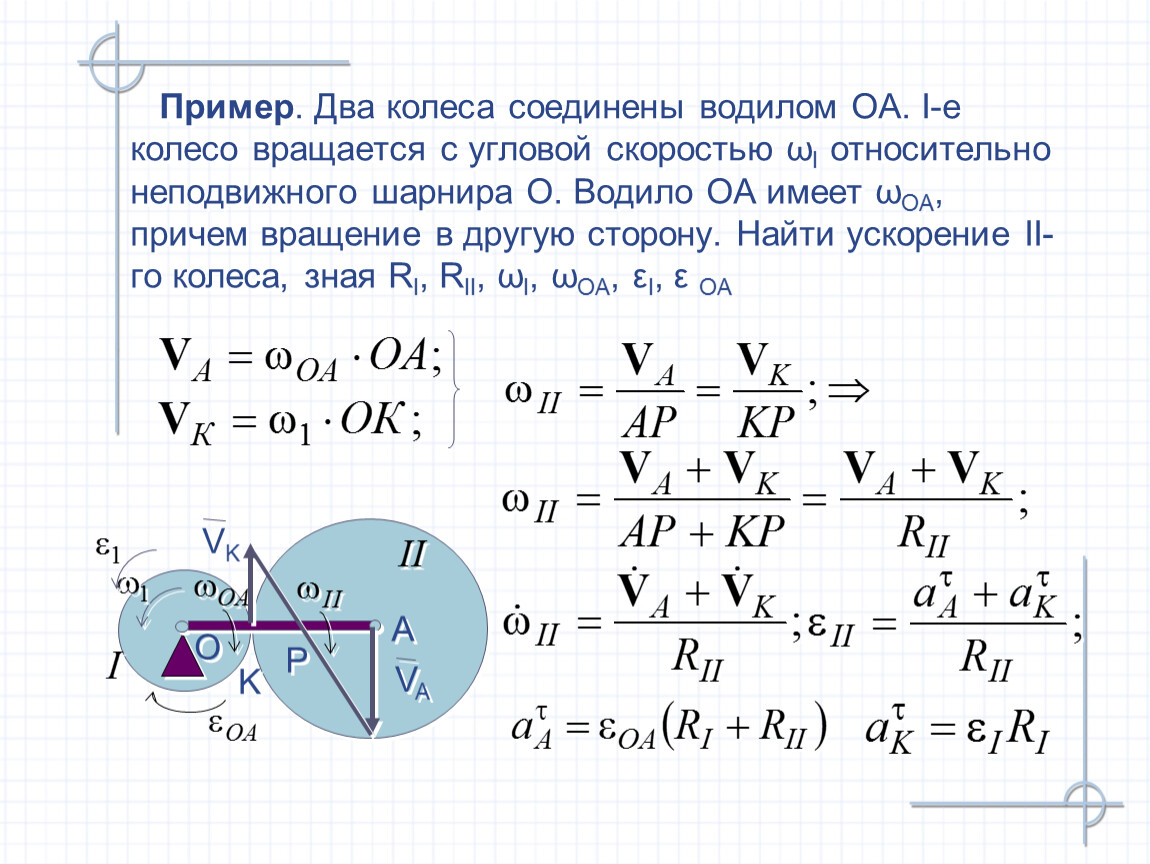 Пример. Два колеса соединены водилом ОА. I-е колесо вращается с угловой скоростью ωI относительно неподвижного шарнира О. Водило ОА имеет ωОА, причем вращение в другую сторону. Найти ускорение II-го колеса, зная RI, RII, ωI, ωОА, εI, ε ОА