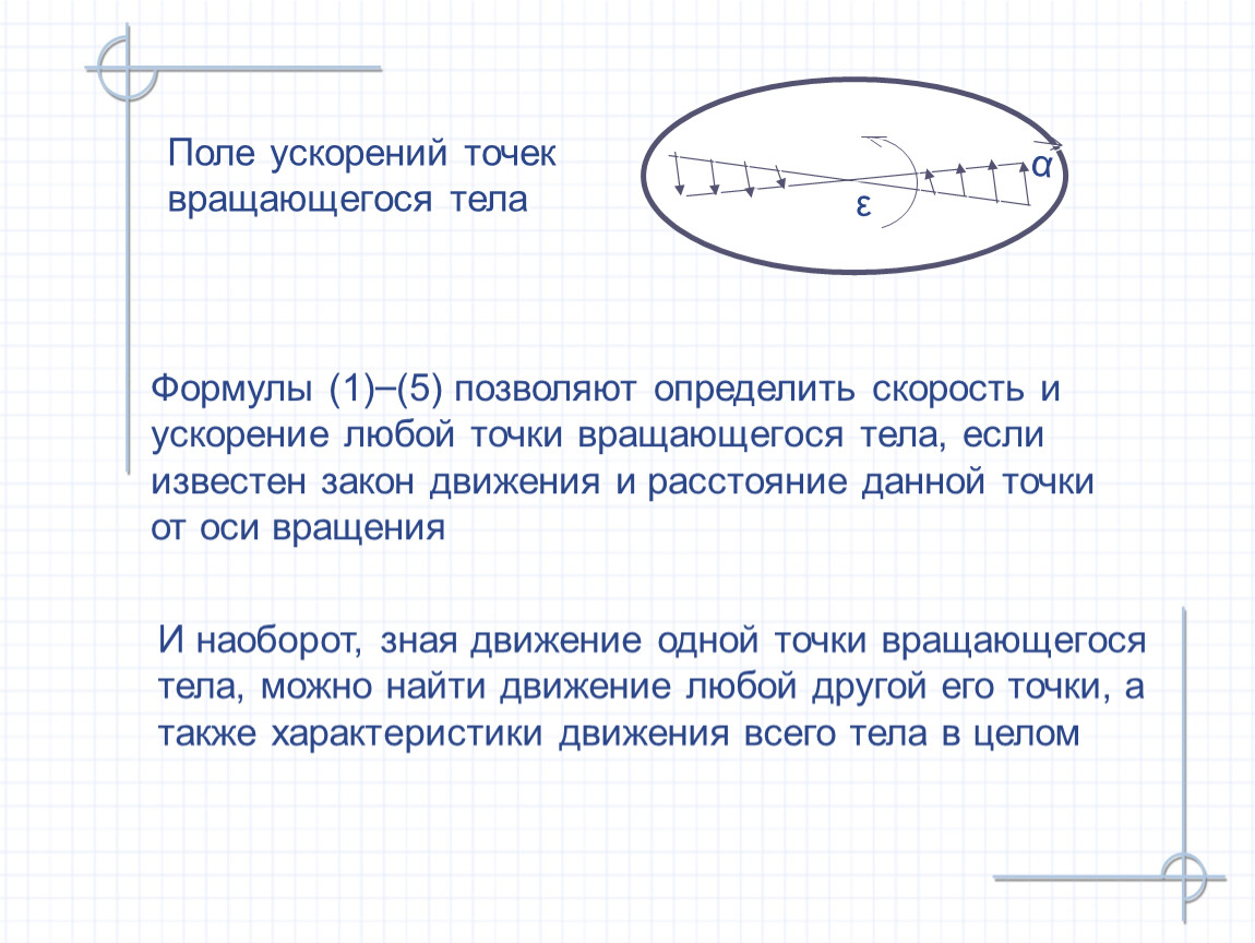 Формулы (1)–(5) позволяют определить скорость и ускорение любой точки вращающегося тела, если известен закон движения и расстояние данной точки от оси вращения