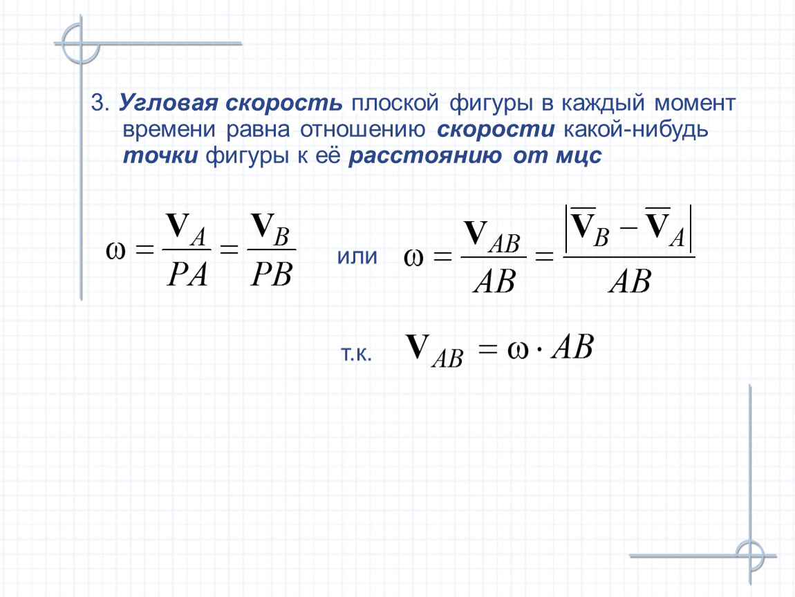 3. Угловая скорость плоской фигуры в каждый момент времени равна отношению скорости какой-нибудь точки фигуры к её расстоянию от мцс
