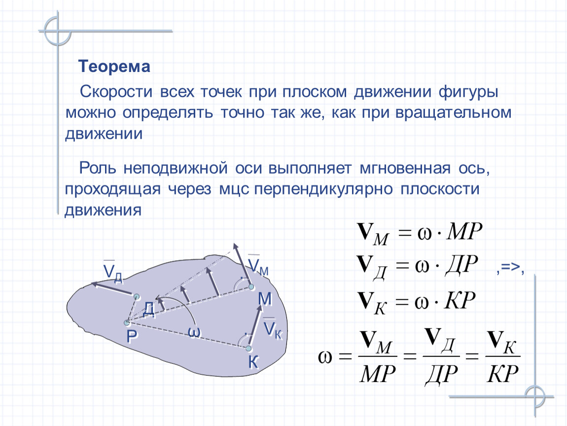 Роль неподвижной оси выполняет мгновенная ось, проходящая через мцс перпендикулярно плоскости движения