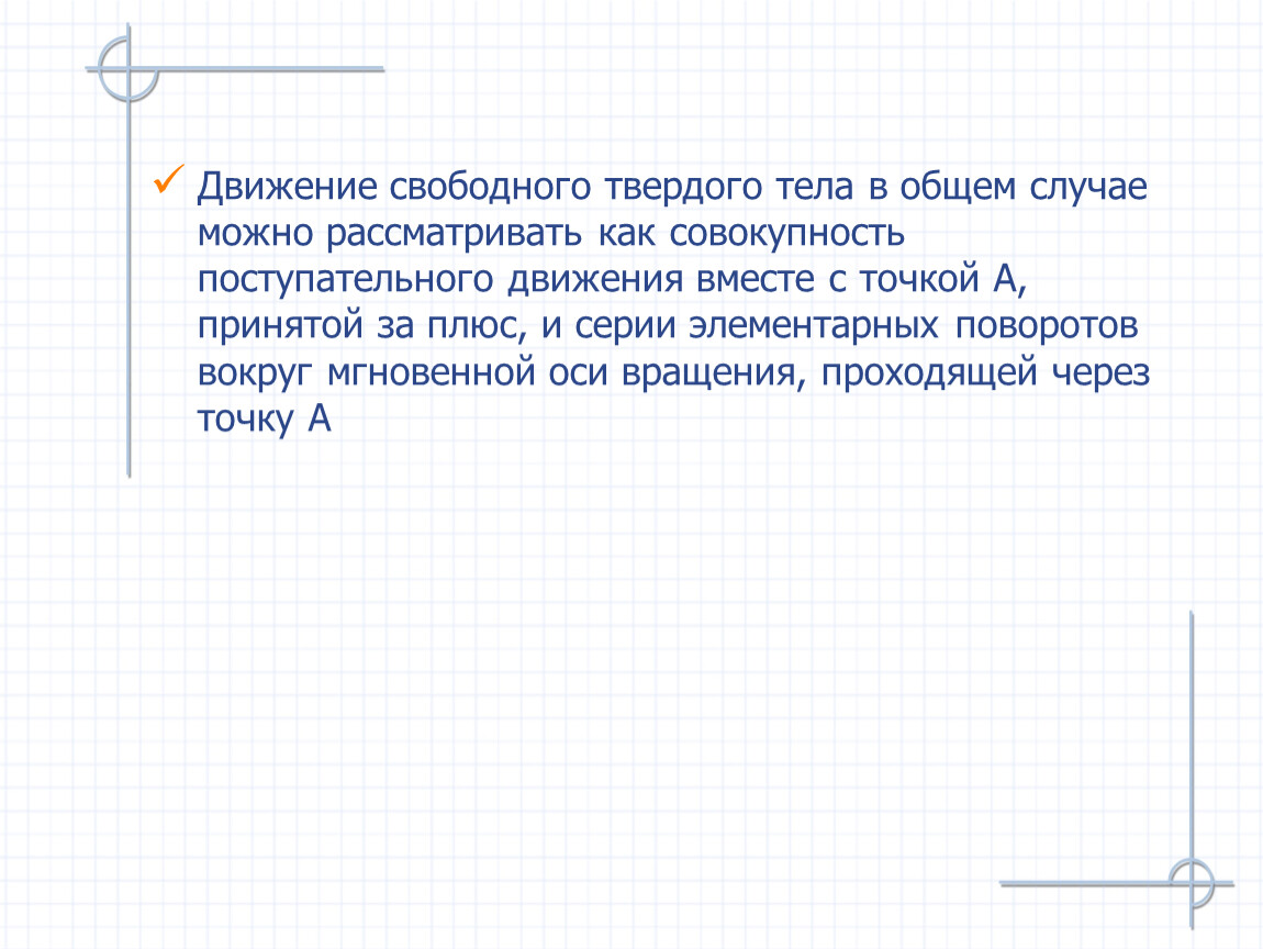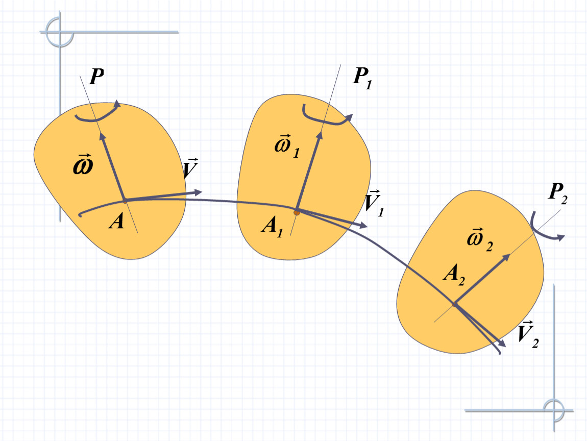 Движение свободного твердого тела в общем случае можно рассматривать как совокупность поступательного движения вместе с точкой А, принятой за плюс, и серии элементарных поворотов вокруг мгновенной оси вращения, проходящей через точку А