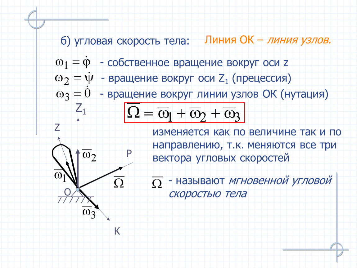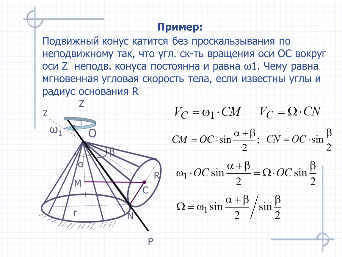 Подвижный конус катится без проскальзывания по неподвижному так, что угл. ск-ть вращения оси ОС вокруг оси Z неподв. конуса постоянна и равна ω1. Чему равна мгновенная угловая скорость тела, если известны углы и радиус основания R