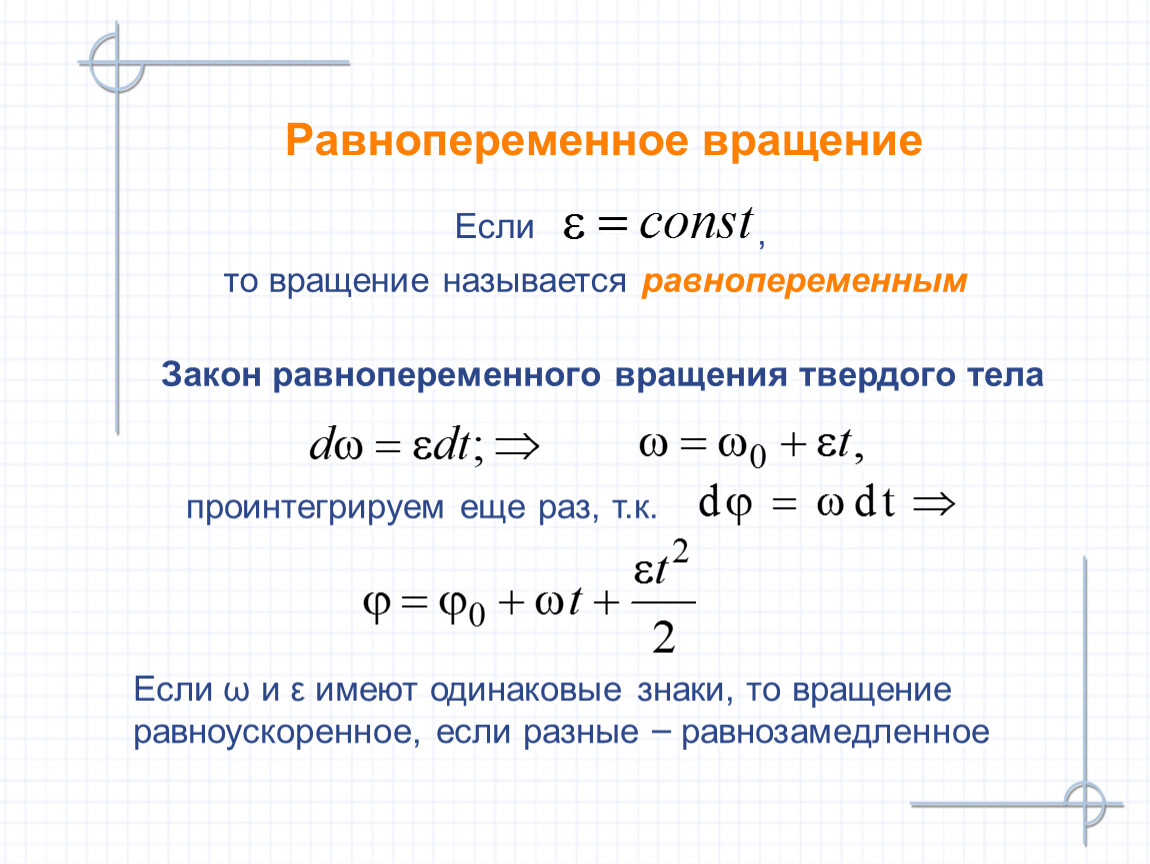 Если ω и ε имеют одинаковые знаки, то вращение равноускоренное, если разные – равнозамедленное