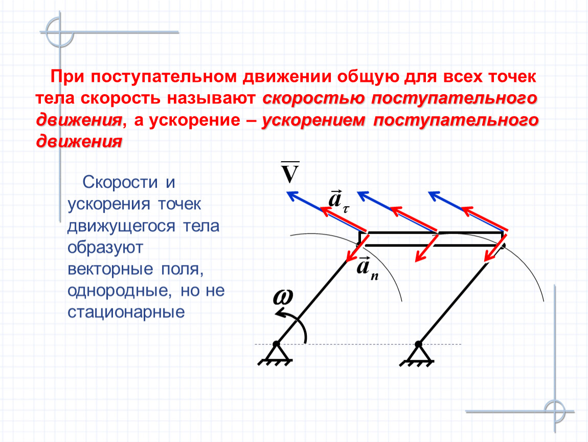 При поступательном движении общую для всех точек тела скорость называют скоростью поступательного движения, а ускорение – ускорением поступательного движения