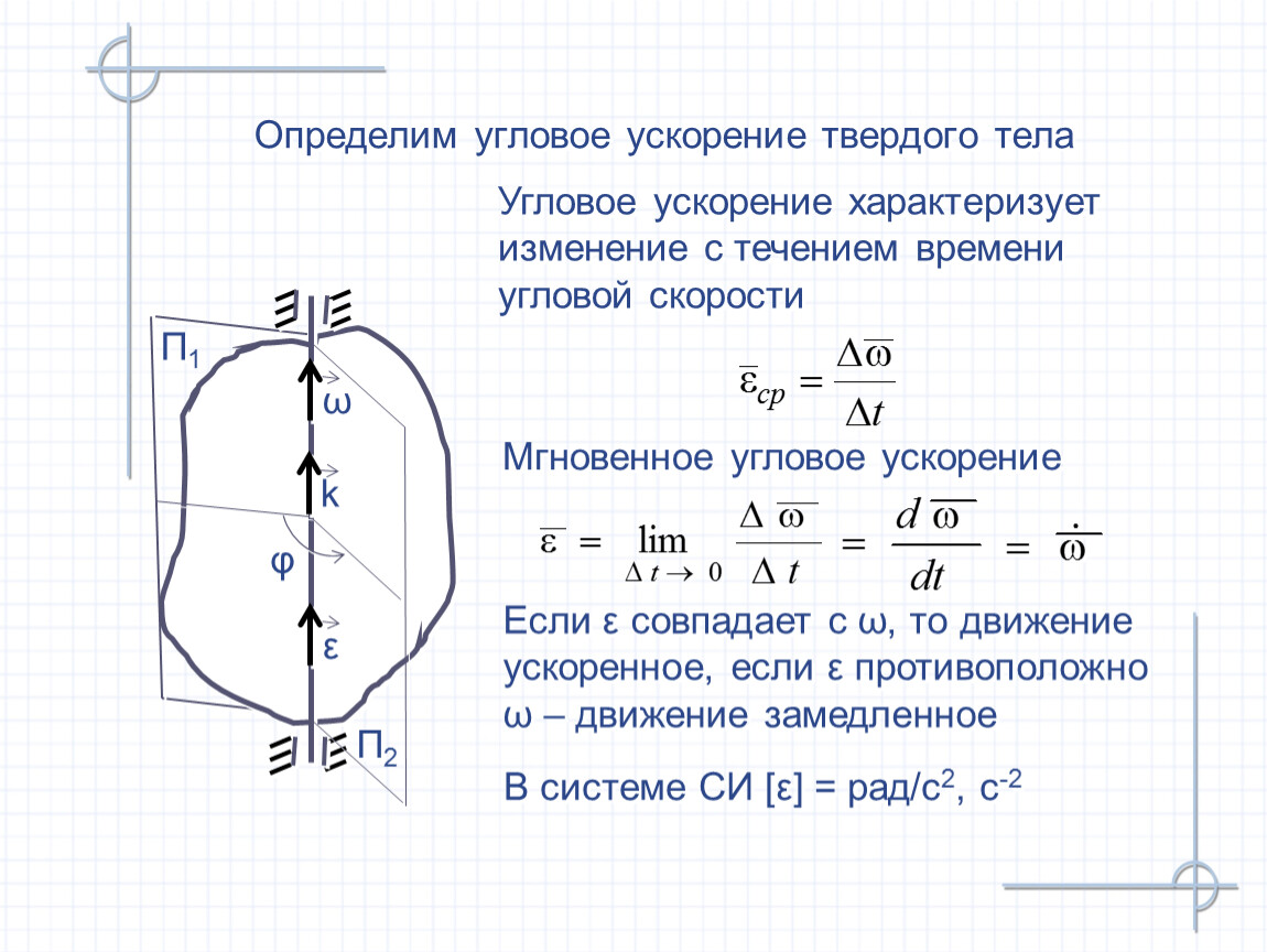 Векторная величина, характеризующая изменение с течением времени угловой скорости по модулю и по направлению – мгновенное угловое ускорение тела