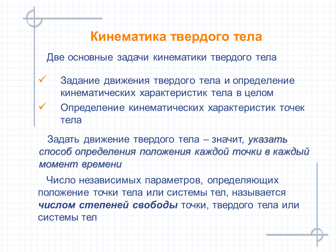 Число независимых параметров, определяющих положение точки тела или системы тел, называется числом степеней свободы точки, твердого тела или системы тел