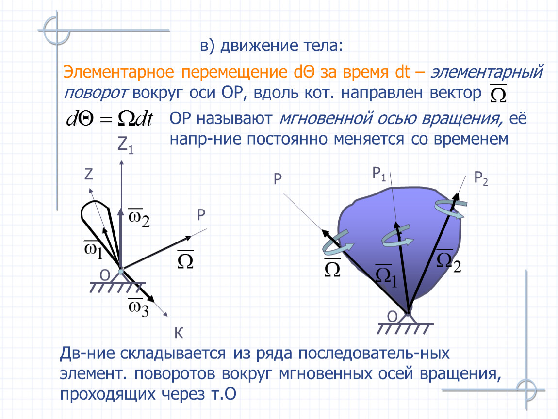 Дв-ние складывается из ряда последователь-ных элемент. поворотов вокруг мгновенных осей вращения, проходящих через т.О