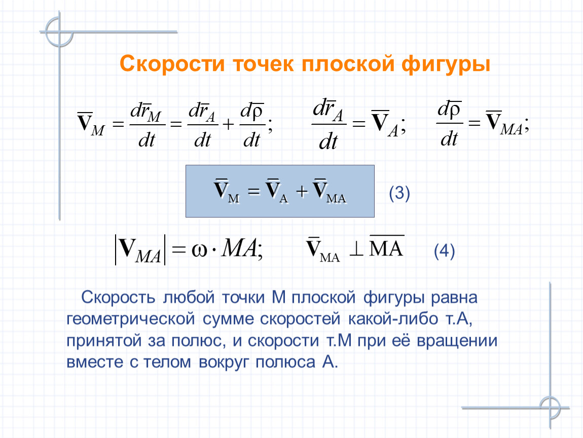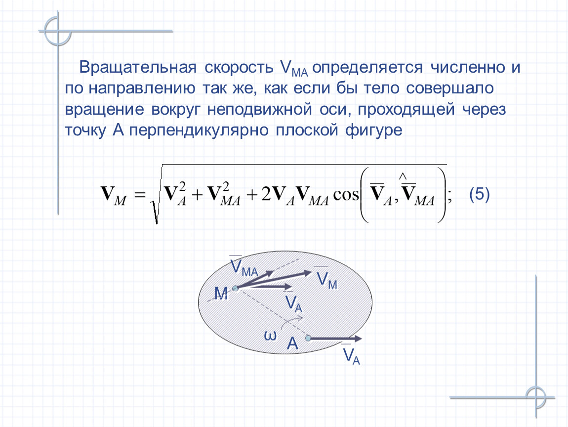 Вращательная скорость VMA определяется численно и по направлению так же, как если бы тело совершало вращение вокруг неподвижной оси, проходящей через точку А перпендикулярно плоской фигуре