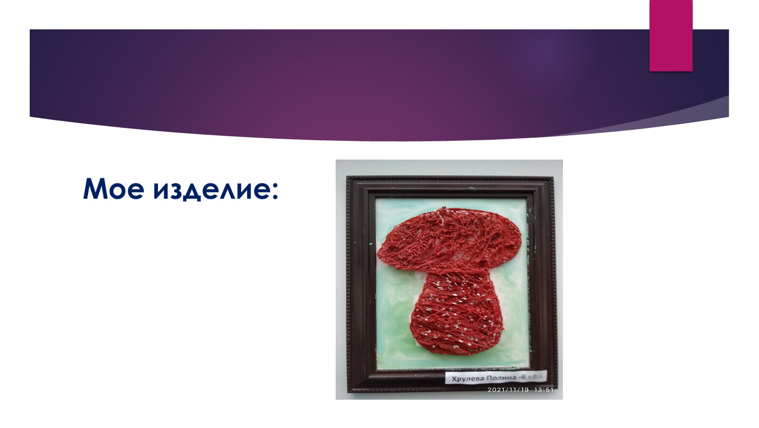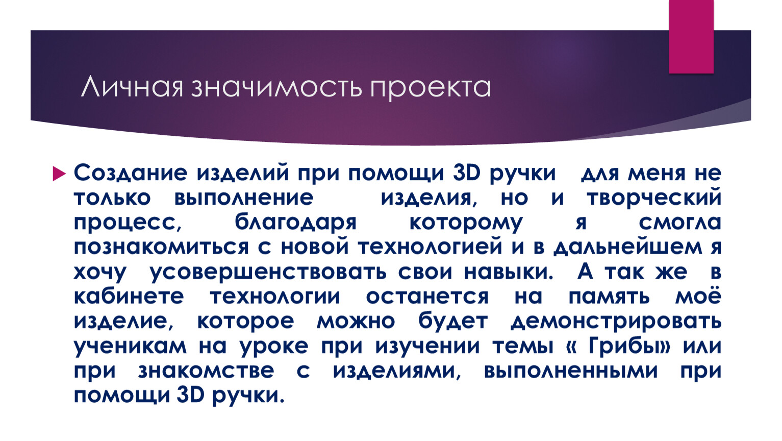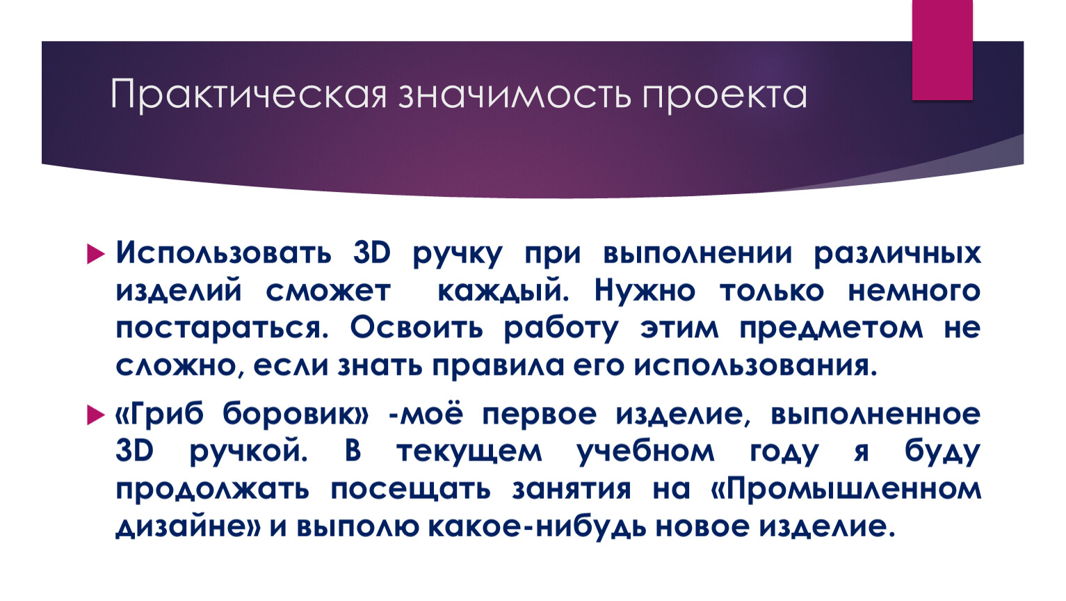 Создание изделий при помощи 3D ручки для меня не только выполнение изделия, но и творческий процесс, благодаря которому я смогла познакомиться с новой технологией и в дальнейшем я хочу усовершенствовать свои навыки. А так же в кабинете технологии останется на память моё изделие, которое можно будет демонстрировать ученикам на уроке при изучении темы « Грибы» или при знакомстве с изделиями, выполненными при помощи 3D ручки.