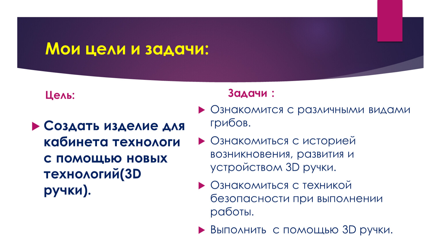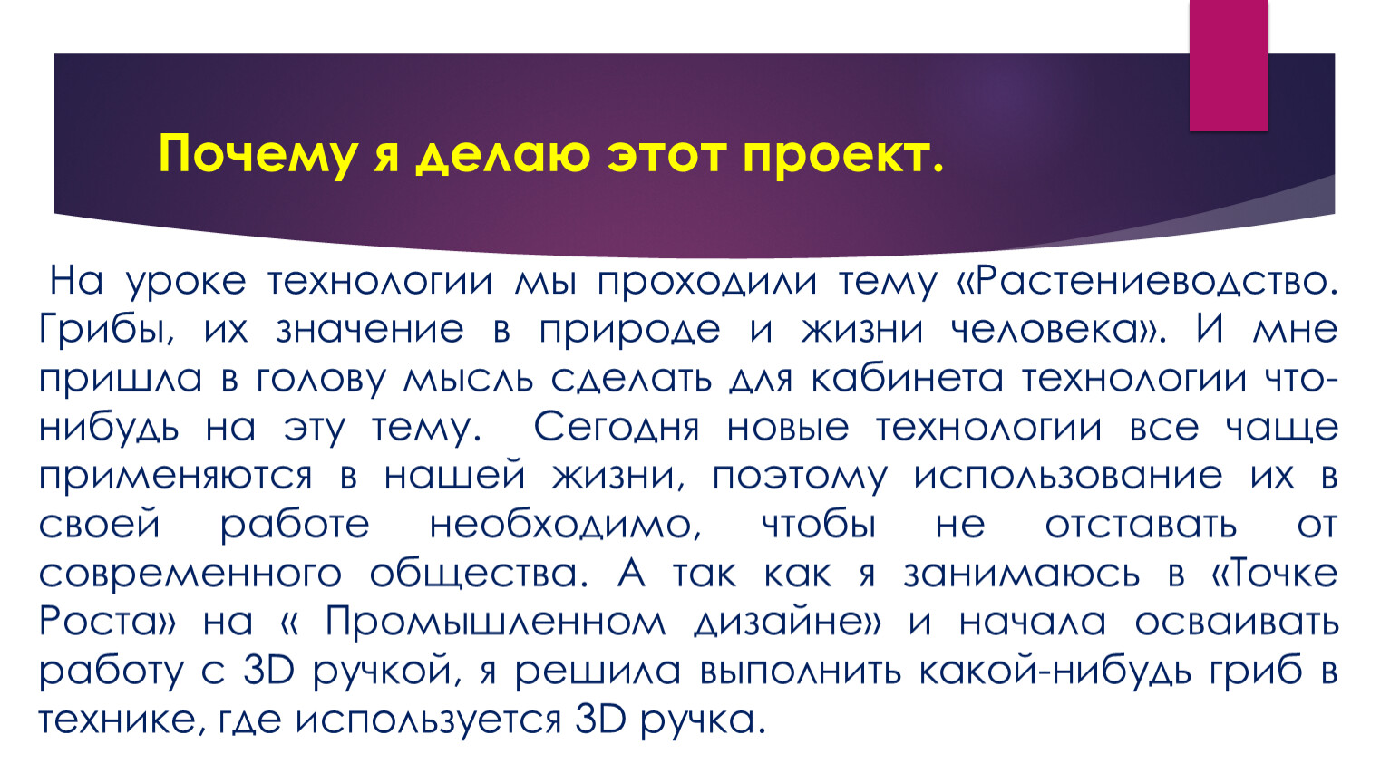 На уроке технологии мы проходили тему «Растениеводство. Грибы, их значение в природе и жизни человека». И мне пришла в голову мысль сделать для кабинета технологии что-нибудь на эту тему. Сегодня новые технологии все чаще применяются в нашей жизни, поэтому использование их в своей работе необходимо, чтобы не отставать от современного общества. А так как я занимаюсь в «Точке Роста» на « Промышленном дизайне» и начала осваивать работу с 3D ручкой, я решила выполнить какой-нибудь гриб в технике, где используется 3D ручка.