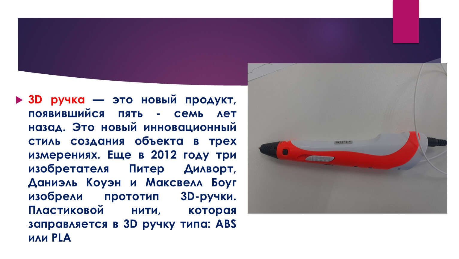 3D ручка — это новый продукт, появившийся пять - семь лет назад. Это новый инновационный стиль создания объекта в трех измерениях. Еще в 2012 году три изобретателя Питер Дилворт, Даниэль Коуэн и Максвелл Боуг изобрели прототип 3D-ручки. Пластиковой нити, которая заправляется в 3D ручку типа: ABS или PLA