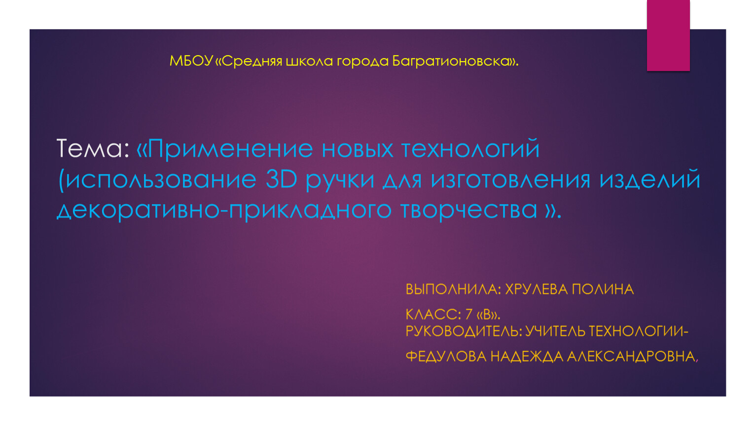Тема: «Применение новых технологий(использование 3D ручки для изготовления изделий декоративно-прикладного творчества ».