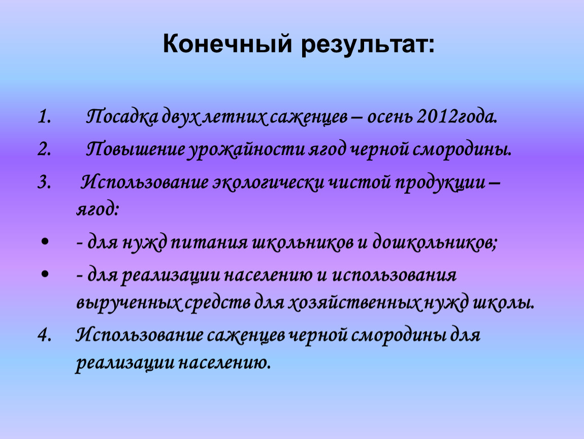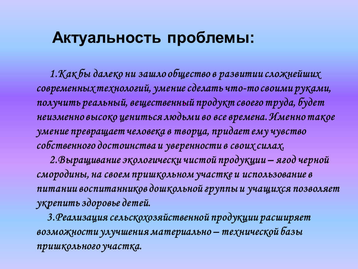 1.Как бы далеко ни зашло общество в развитии сложнейших современных технологий, умение сделать что-то своими руками, получить реальный, вещественный продукт своего труда, будет неизменно высоко цениться людьми во все времена. Именно такое умение превращает человека в творца, придает ему чувство собственного достоинства и уверенности в своих силах. 2.Выращивание экологически чистой продукции – ягод черной смородины, на своем пришкольном участке и использование в питании воспитанников дошкольной группы и учащихся позволяет укрепить здоровье детей. 3.Реализация сельскохозяйственной продукции расширяет возможности улучшения материально – технической базы пришкольного участка.