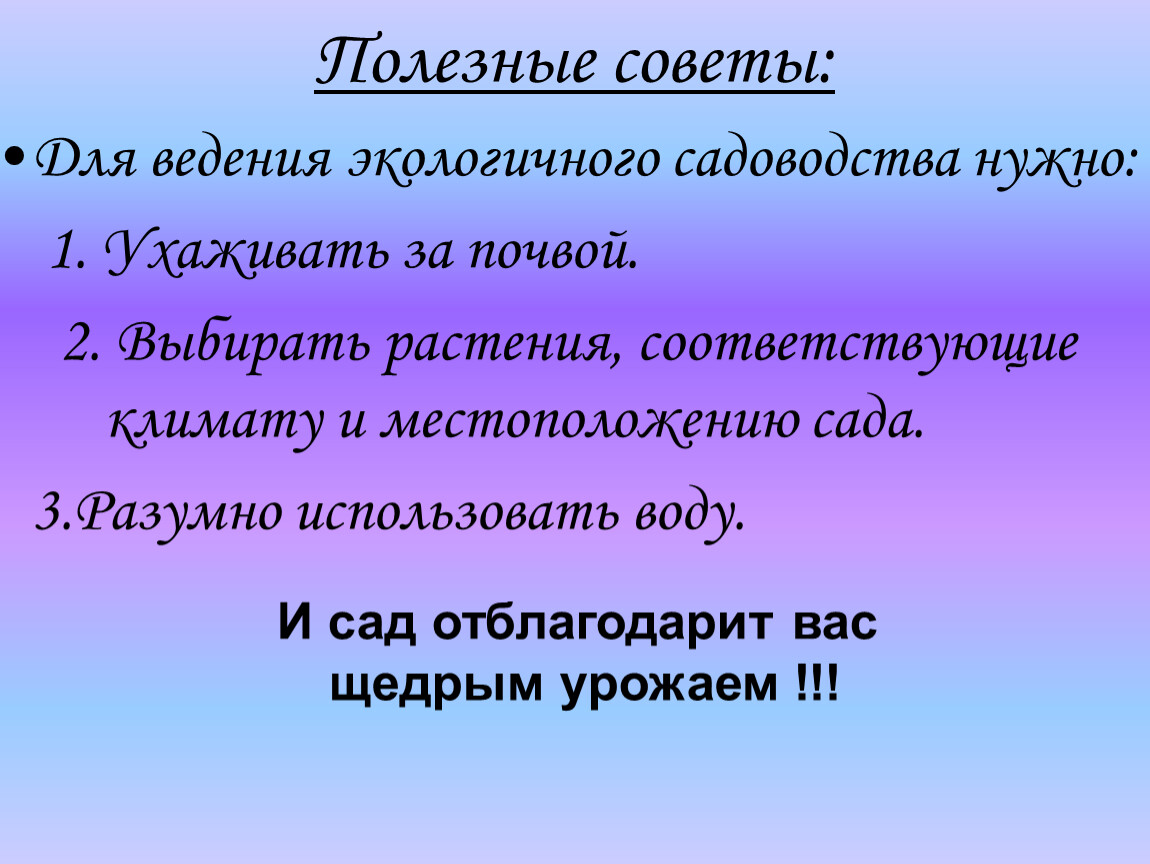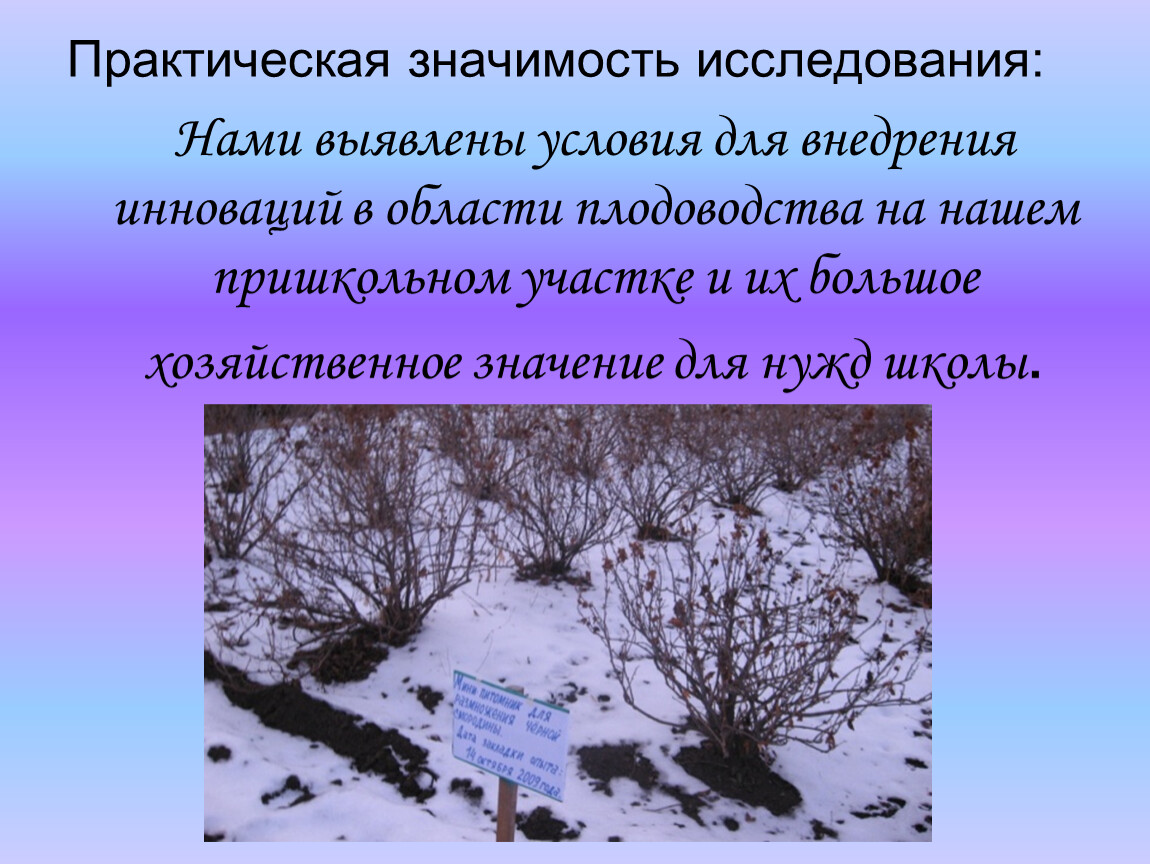 Нами выявлены условия для внедрения инноваций в области плодоводства на нашем пришкольном участке и их большое хозяйственное значение для нужд школы.