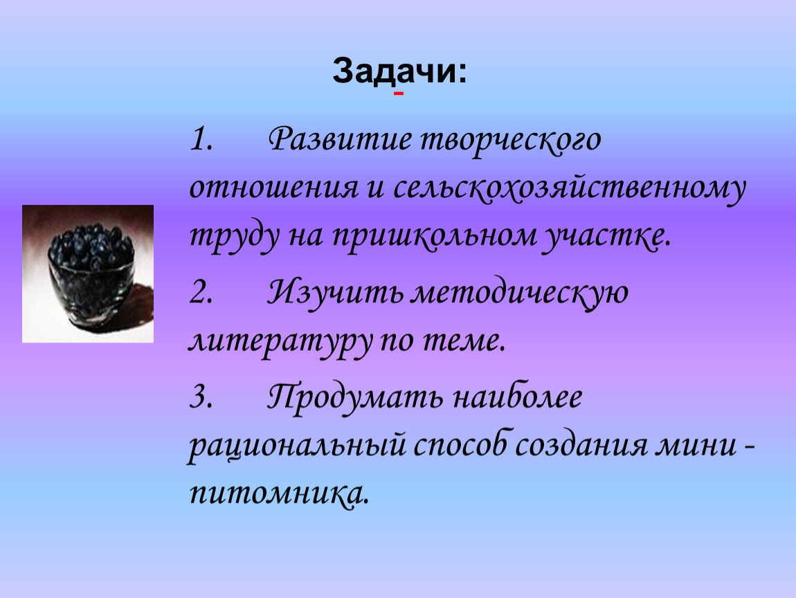 1. Развитие творческого отношения и сельскохозяйственному труду на пришкольном участке.