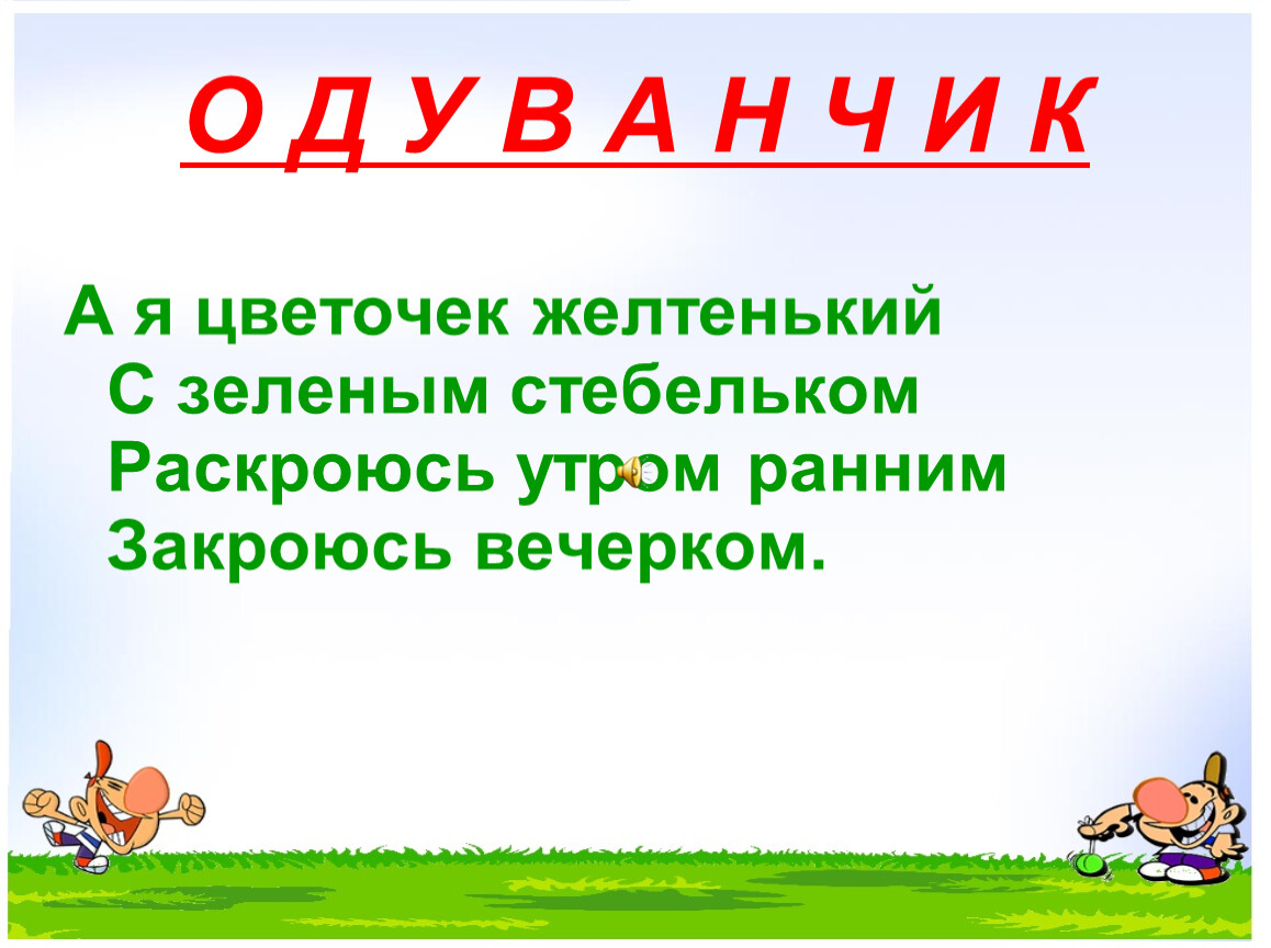 А я цветочек желтенький С зеленым стебельком Раскроюсь утром ранним Закроюсь вечерком.
