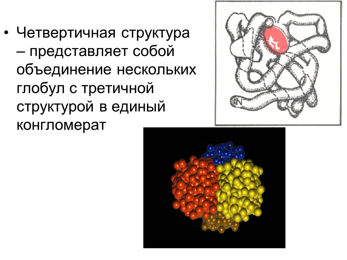 Четвертичная структура – представляет собой объединение нескольких глобул с третичной структурой в единый конгломерат