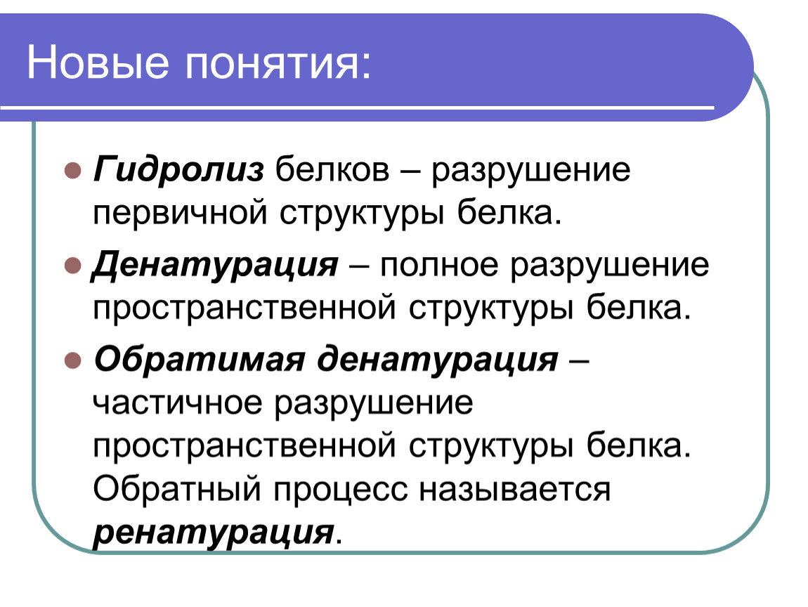 Обратимая денатурация – частичное разрушение пространственной структуры белка. Обратный процесс называется ренатурация.