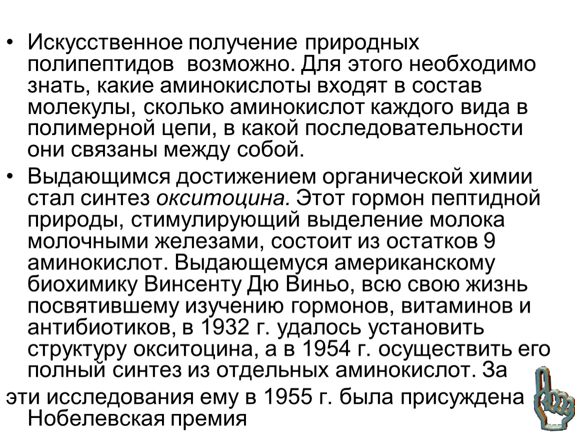 Выдающимся достижением органической химии стал синтез окситоцина. Этот гормон пептидной природы, стимулирующий выделение молока молочными железами, состоит из остатков 9 аминокислот. Выдающемуся американскому биохимику Винсенту Дю Виньо, всю свою жизнь посвятившему изучению гормонов, витаминов и антибиотиков, в 1932 г. удалось установить структуру окситоцина, а в 1954 г. осуществить его полный синтез из отдельных аминокислот. За