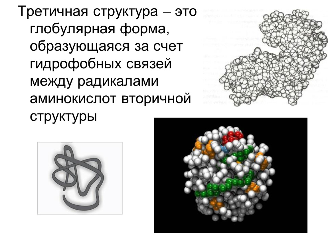 Третичная структура – это глобулярная форма, образующаяся за счет гидрофобных связей между радикалами аминокислот вторичной структуры