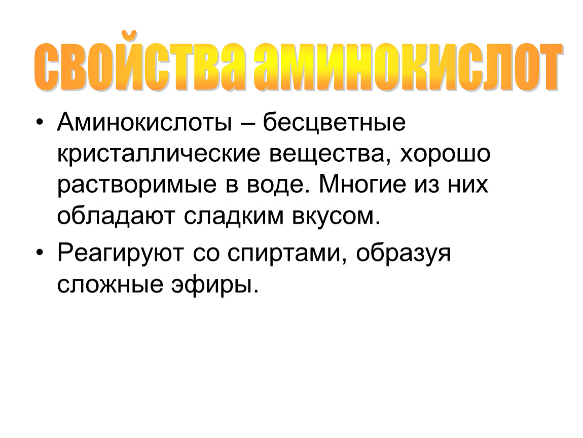 Аминокислоты – бесцветные кристаллические вещества, хорошо растворимые в воде. Многие из них обладают сладким вкусом.