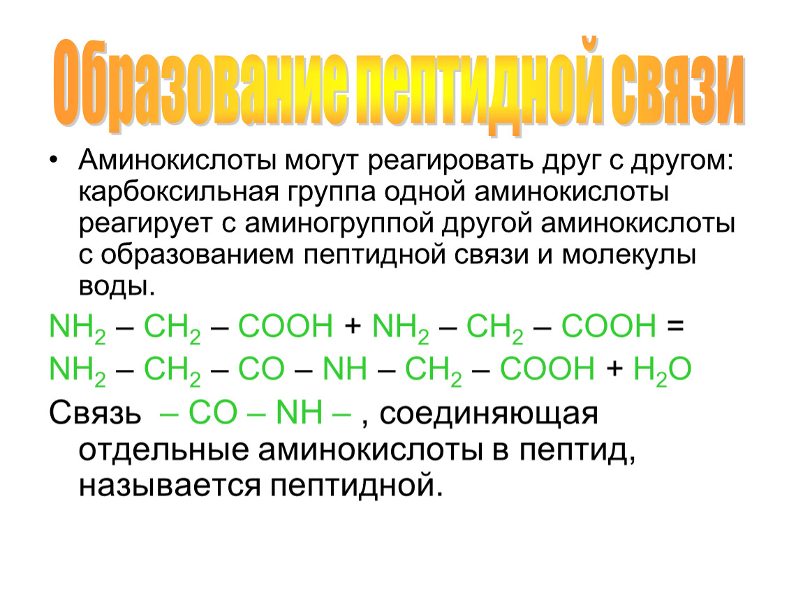 Аминокислоты могут реагировать друг с другом: карбоксильная группа одной аминокислоты реагирует с аминогруппой другой аминокислоты с образованием пептидной связи и молекулы воды.