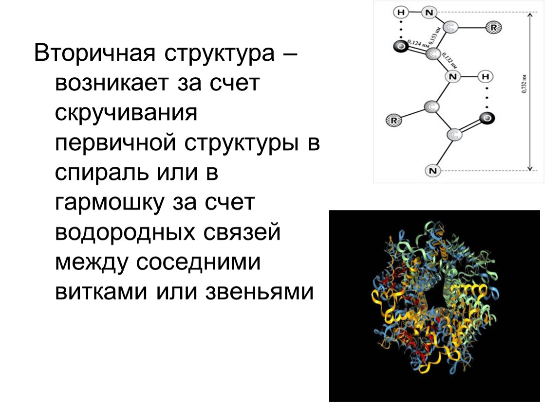 Вторичная структура – возникает за счет скручивания первичной структуры в спираль или в гармошку за счет водородных связей между соседними витками или звеньями