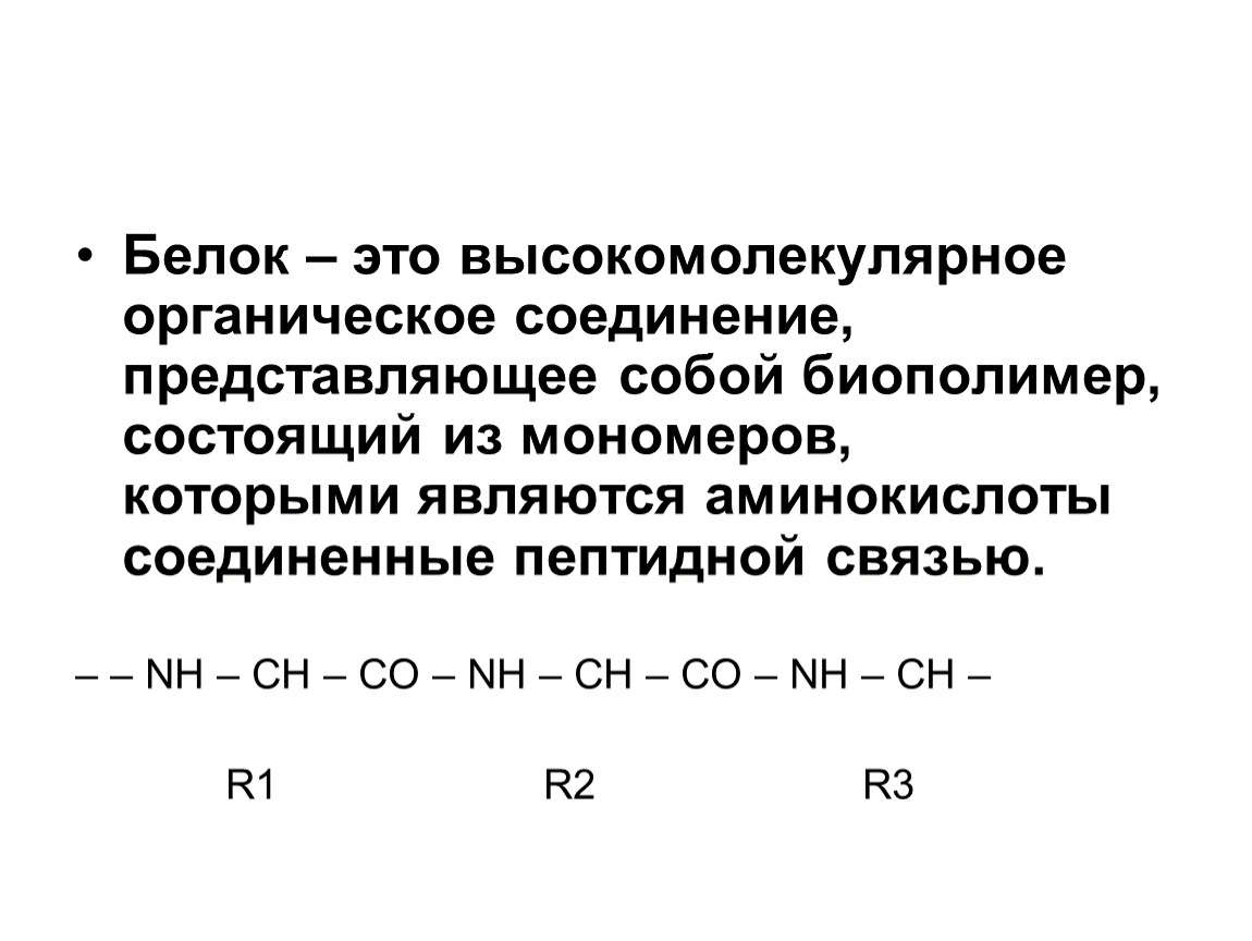 Белок – это высокомолекулярное органическое соединение, представляющее собой биополимер, состоящий из мономеров, которыми являются аминокислоты соединенные пептидной связью.