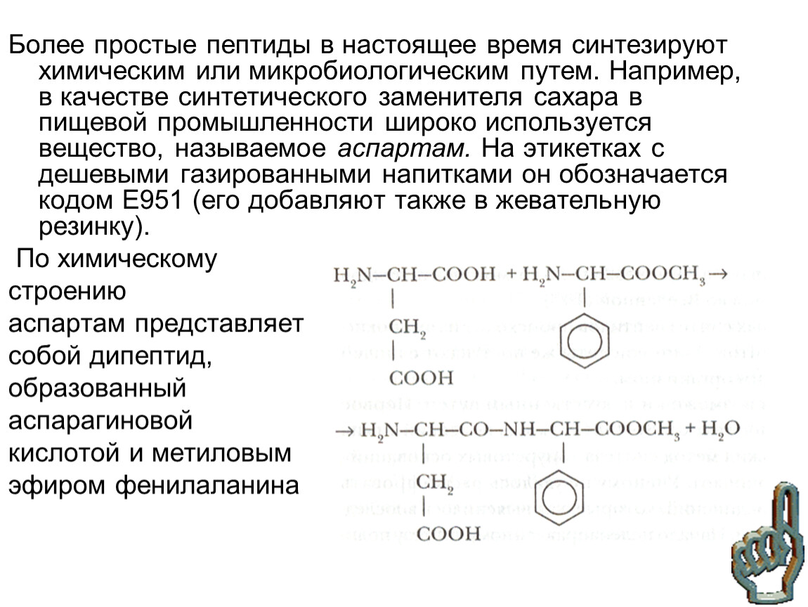 Более простые пептиды в настоящее время синтезируют химическим или микробиологическим путем. Например, в качестве синтетического заменителя сахара в пищевой промышленности широко используется вещество, называемое аспартам. На этикетках с дешевыми газированными напитками он обозначается кодом Е951 (его добавляют также в жевательную резинку).