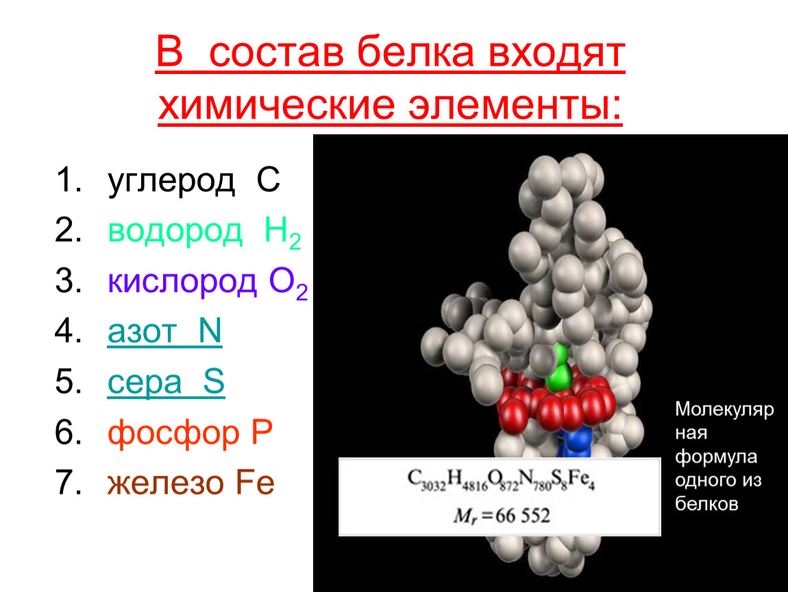 В состав молекулы белка входят: углерод, водород, кислород, азот, сера, фосфор, железо.