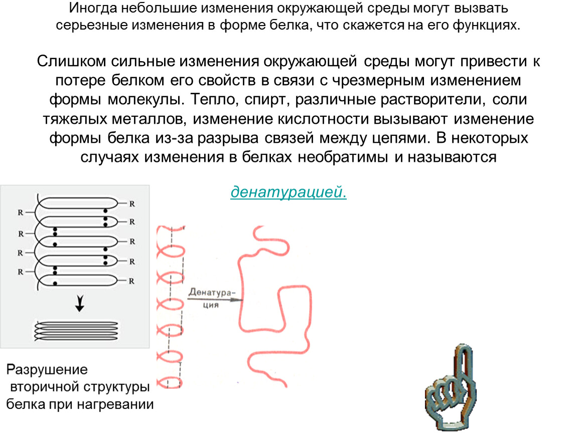 Иногда небольшие изменения окружающей среды могут вызвать серьезные изменения в форме белка, что скажется на его функциях. Слишком сильные изменения окружающей среды могут привести к потере белком его свойств в связи с чрезмерным изменением формы молекулы. Тепло, спирт, различные растворители, соли тяжелых металлов, изменение кислотности вызывают изменение формы белка из-за разрыва связей между цепями. В некоторых случаях изменения в белках необратимы и называются денатурацией.