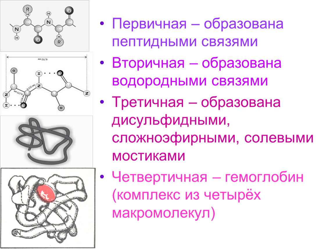Третичная – образована дисульфидными, сложноэфирными, солевыми мостиками