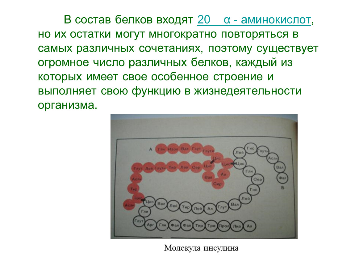 В состав белков входят 20 α - аминокислот, но их остатки могут многократно повторяться в самых различных сочетаниях, поэтому существует огромное число различных белков, каждый из которых имеет свое особенное строение и выполняет свою функцию в жизнедеятельности организма.
