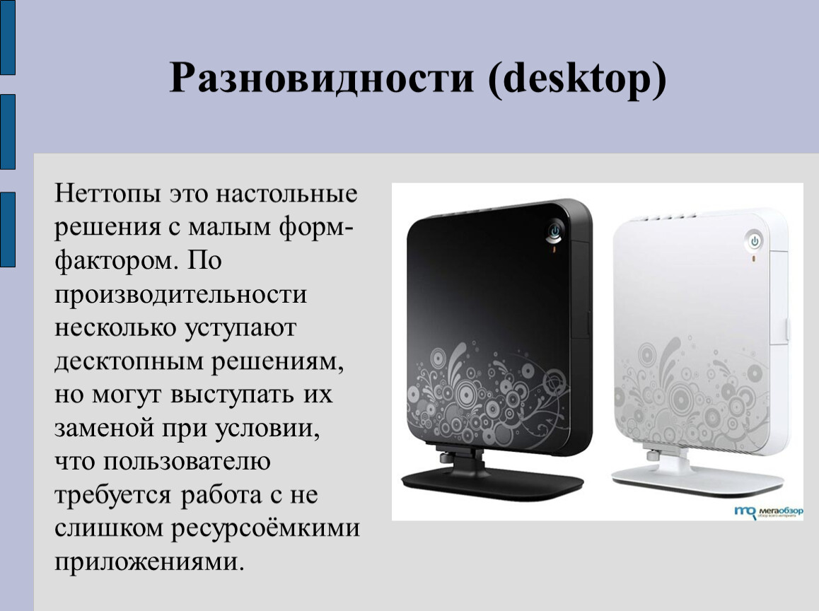 Неттопы это настольные решения с малым форм-фактором. По производительности несколько уступают десктопным решениям, но могут выступать их заменой при условии, что пользователю требуется работа с не слишком ресурсоёмкими приложениями.