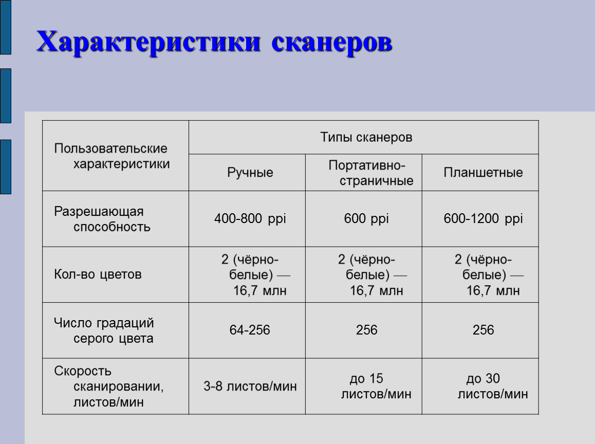 Пользовательские характеристики | Типы сканеров | ||