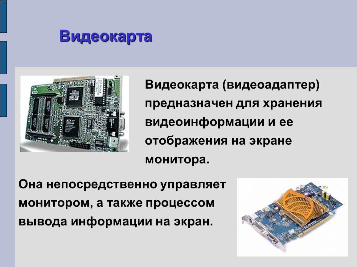 Видеокарта (видеоадаптер) предназначен для хранения видеоинформации и ее отображения на экране монитора.