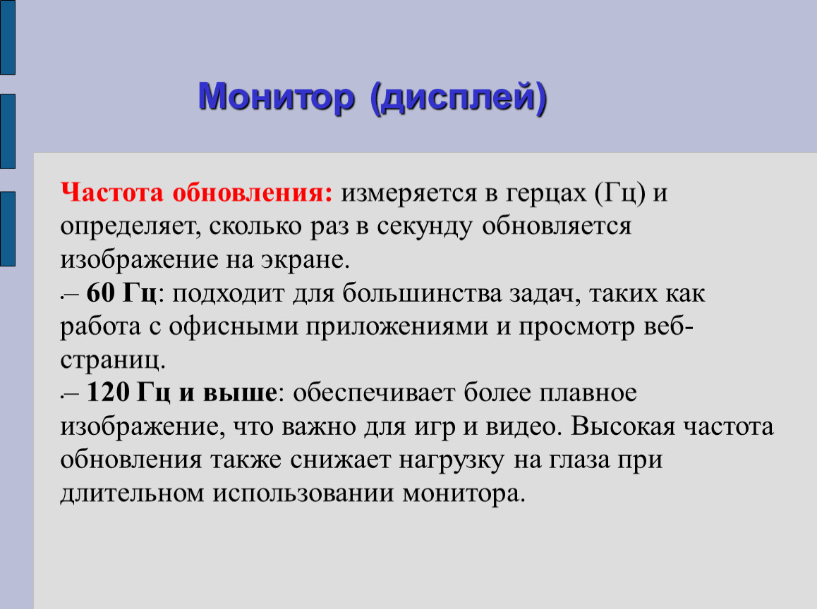 Частота обновления: измеряется в герцах (Гц) и определяет, сколько раз в секунду обновляется изображение на экране.