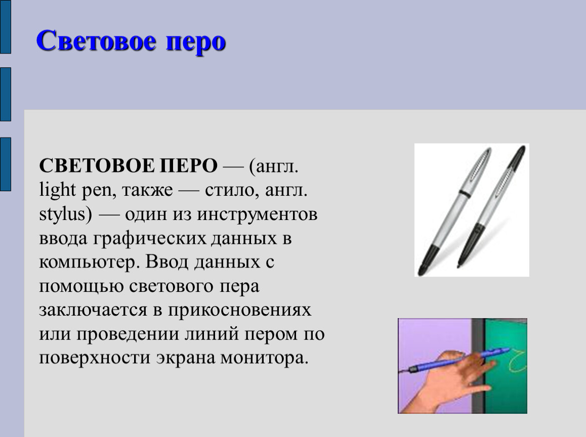 СВЕТОВОЕ ПЕРО — (англ. light pen, также — стило, англ. stylus) — один из инструментов ввода графических данных в компьютер. Ввод данных с помощью светового пера заключается в прикосновениях или проведении линий пером по поверхности экрана монитора.