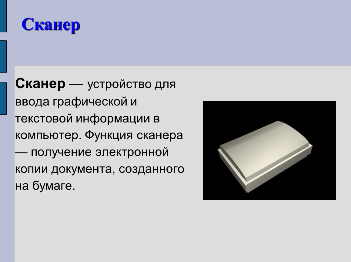 Сканер — устройство для ввода графической и текстовой информации в компьютер. Функция сканера — получение электронной копии документа, созданного на бумаге.