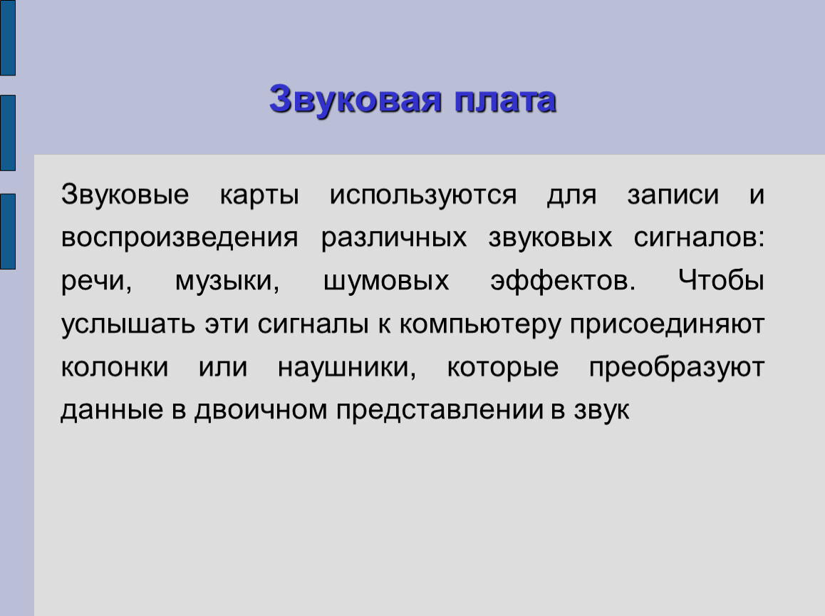 Звуковые карты используются для записи и воспроизведения различных звуковых сигналов: речи, музыки, шумовых эффектов. Чтобы услышать эти сигналы к компьютеру присоединяют колонки или наушники, которые преобразуют данные в двоичном представлении в звук
