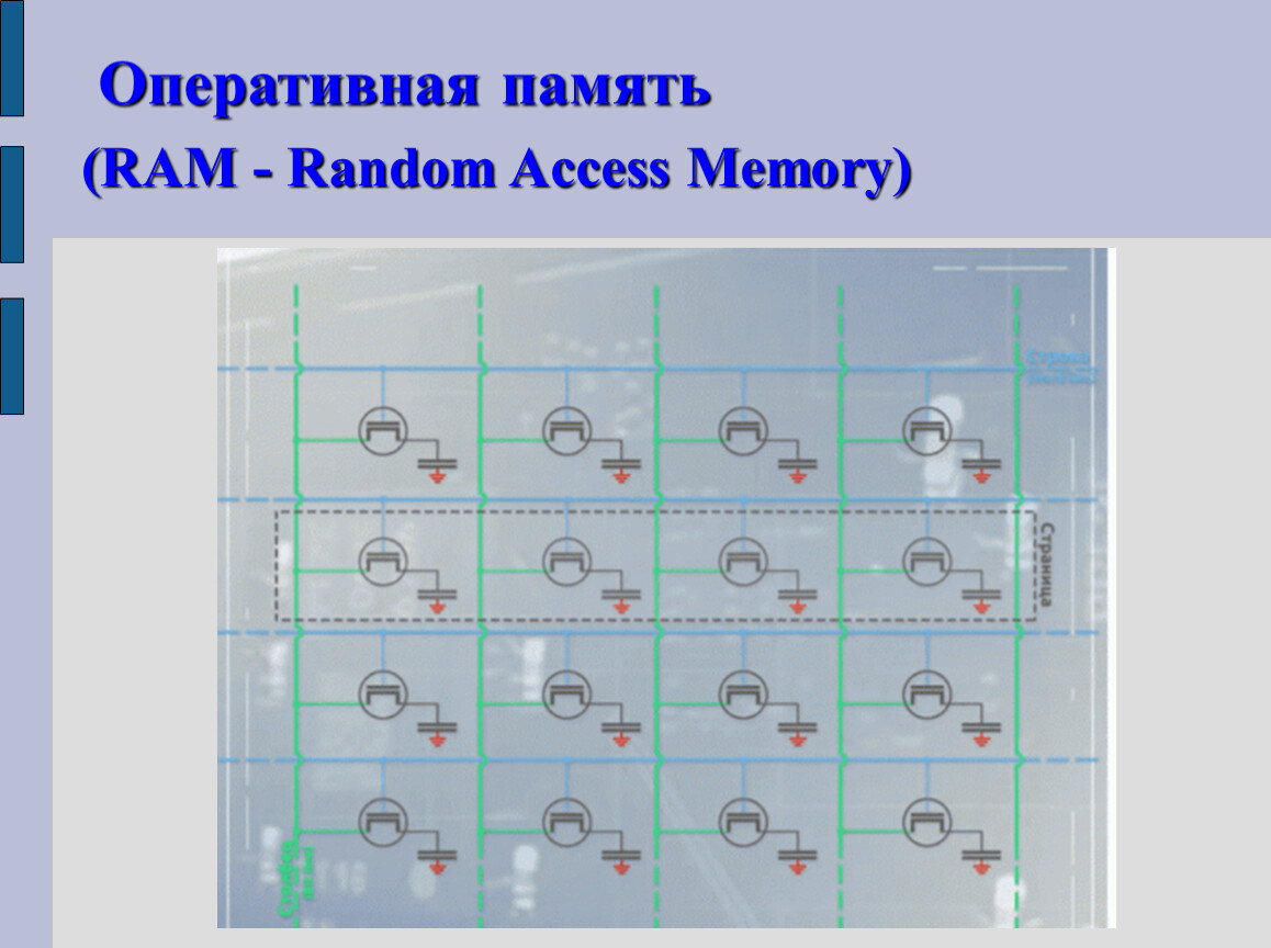 Каждый чип оперативной памяти — это особая матрица из миллионов миниатюрных конденсаторов и транзисторов, конденсаторы могут находиться в заряженном (1) или разряженном (0) состоянии.
