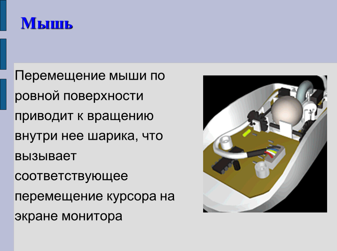 Перемещение мыши по ровной поверхности приводит к вращению внутри нее шарика, что вызывает соответствующее перемещение курсора на экране монитора