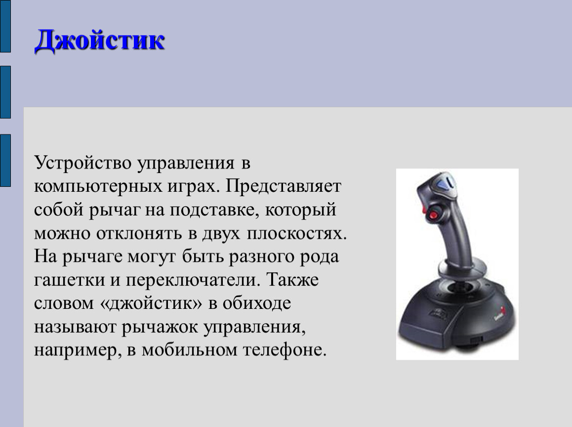 Устройство управления в компьютерных играх. Представляет собой рычаг на подставке, который можно отклонять в двух плоскостях. На рычаге могут быть разного рода гашетки и переключатели. Также словом «джойстик» в обиходе называют рычажок управления, например, в мобильном телефоне.