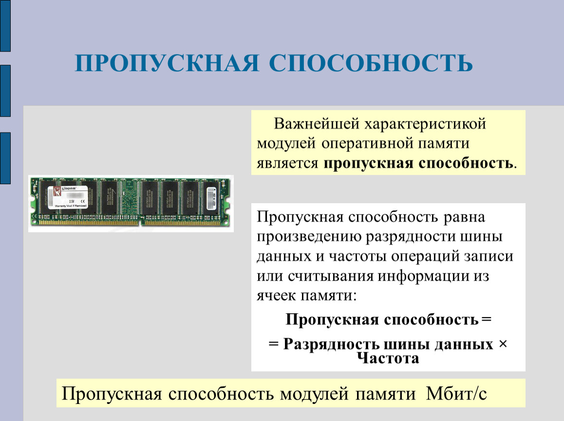 Пропускная способность равна произведению разрядности шины данных и частоты операций записи или считывания информации из ячеек памяти: